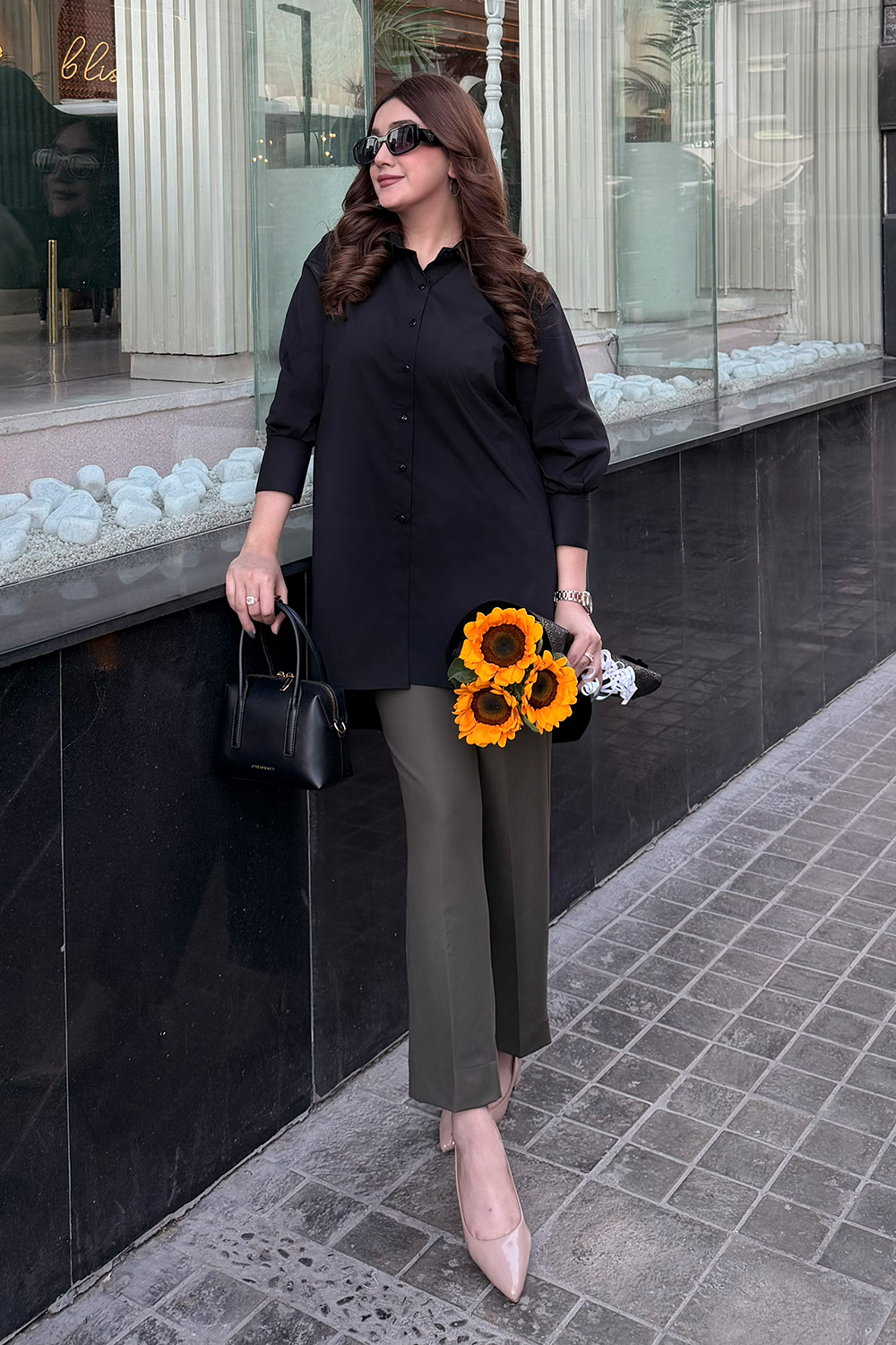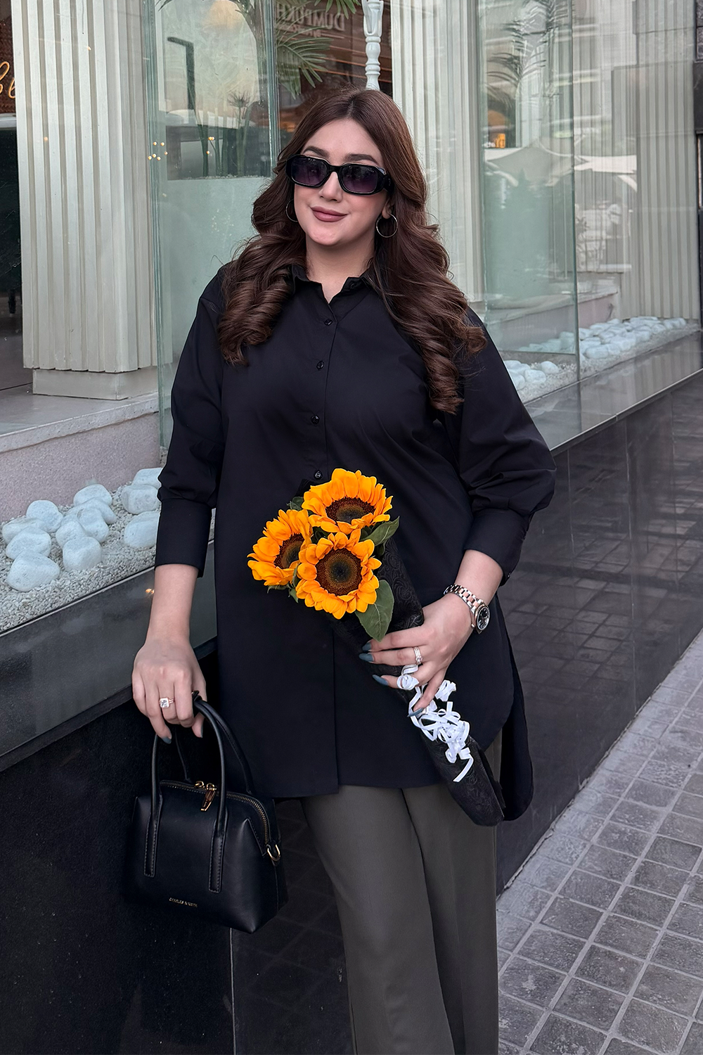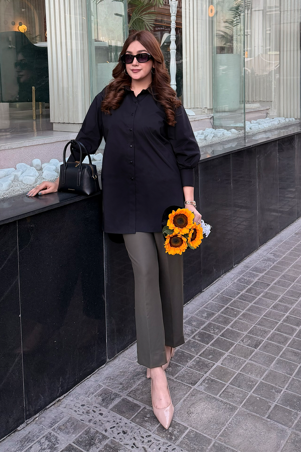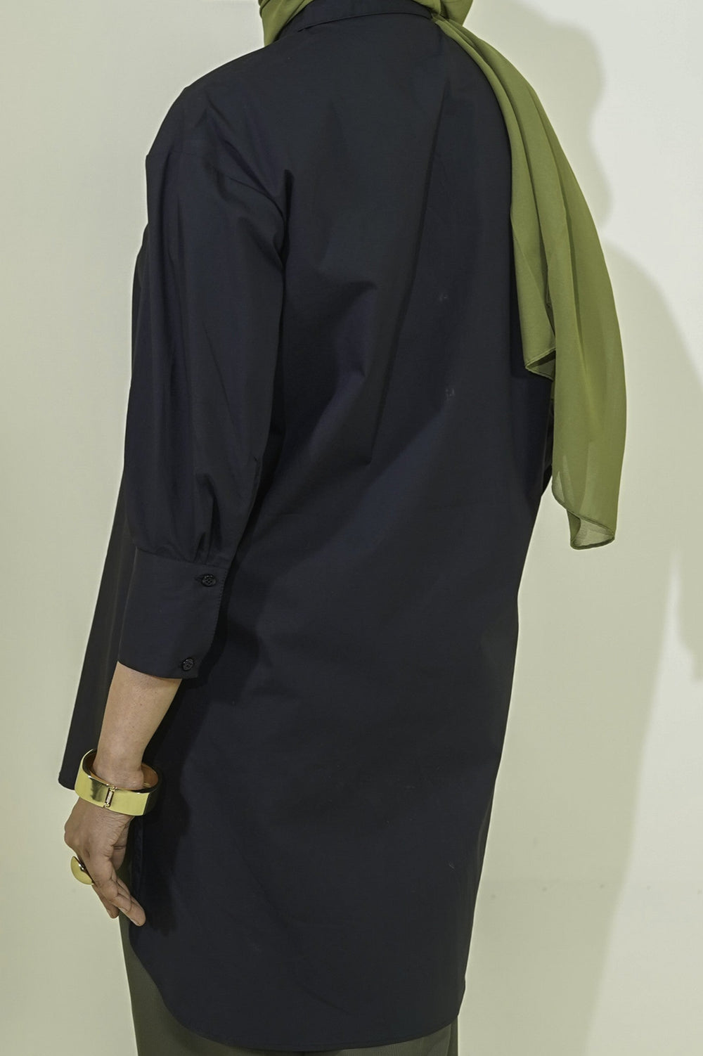 Design: A sleek longline shirt with a relaxed straight cut, featuring a structured collar and clean button-down front for a modern, modest look.